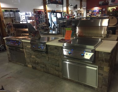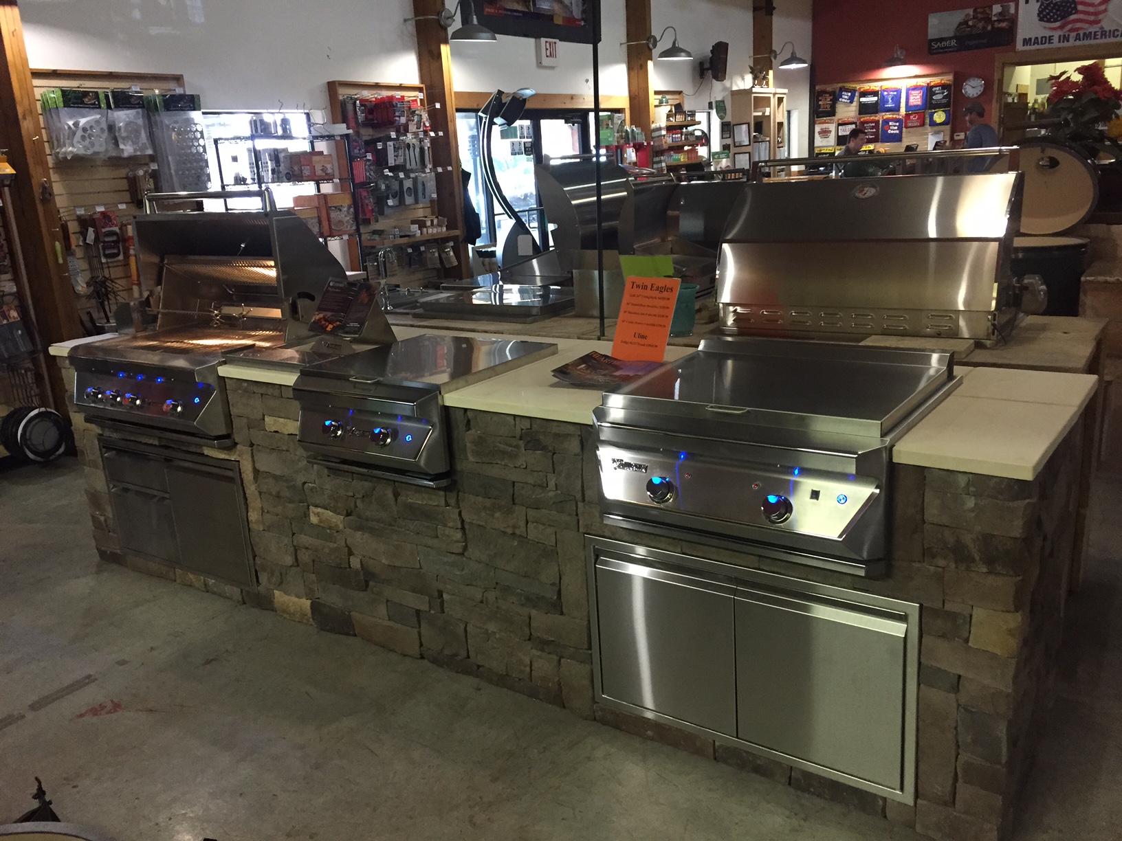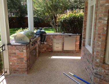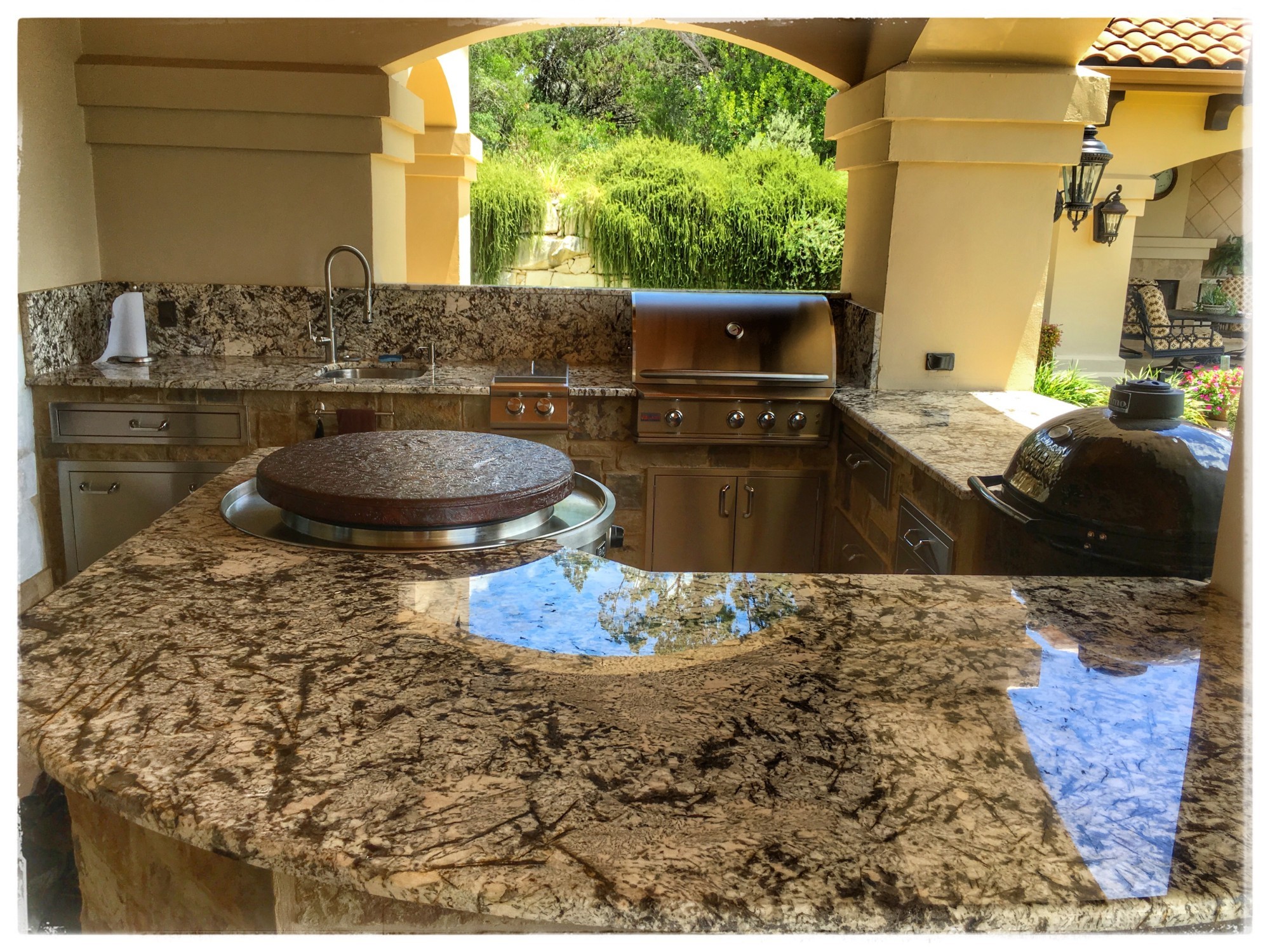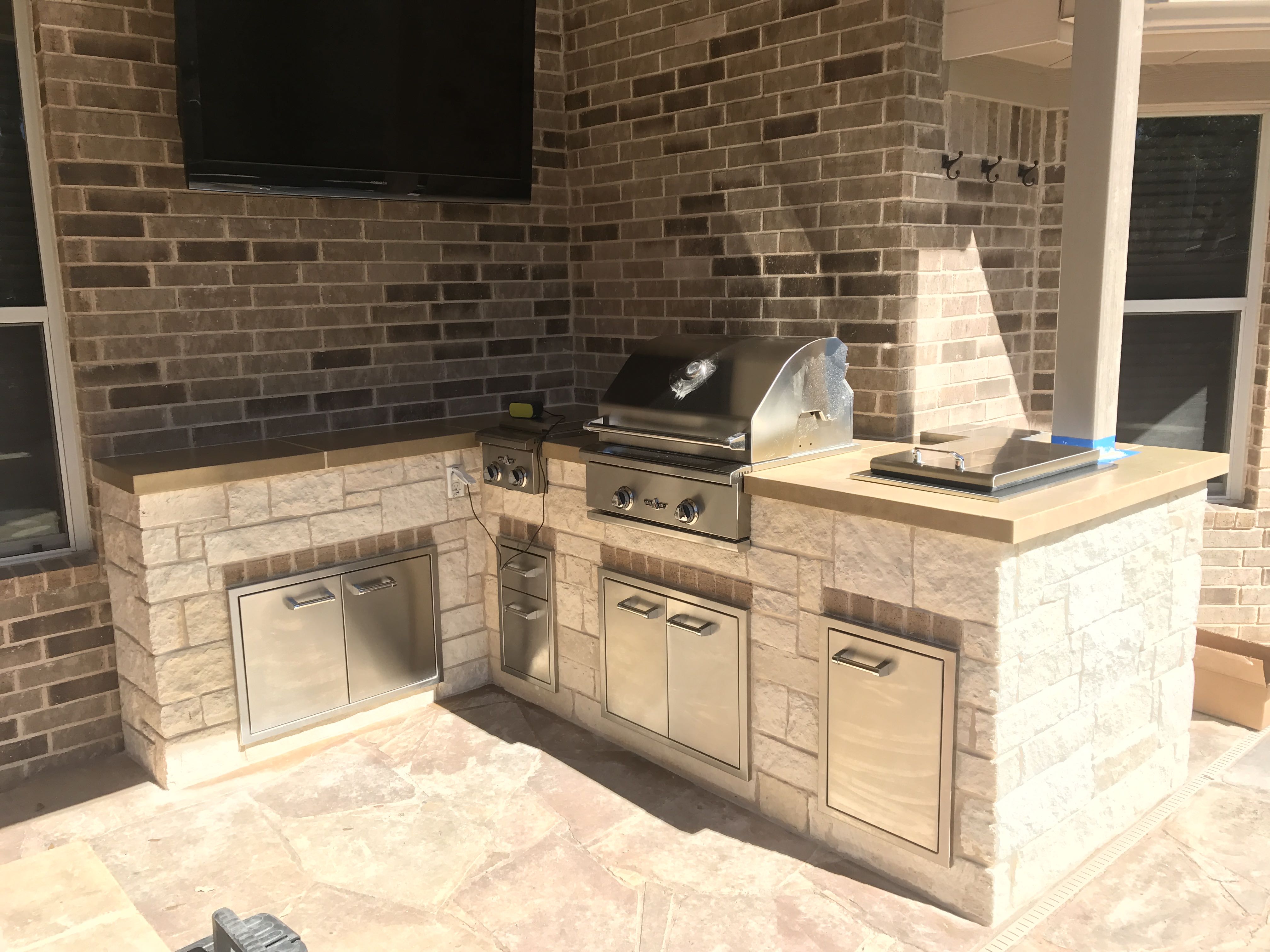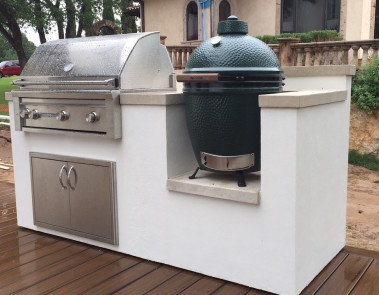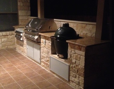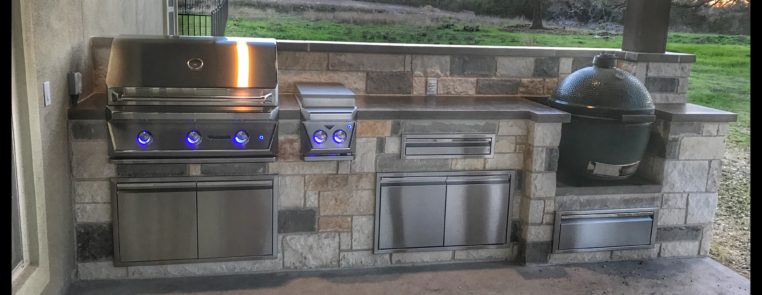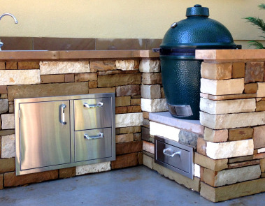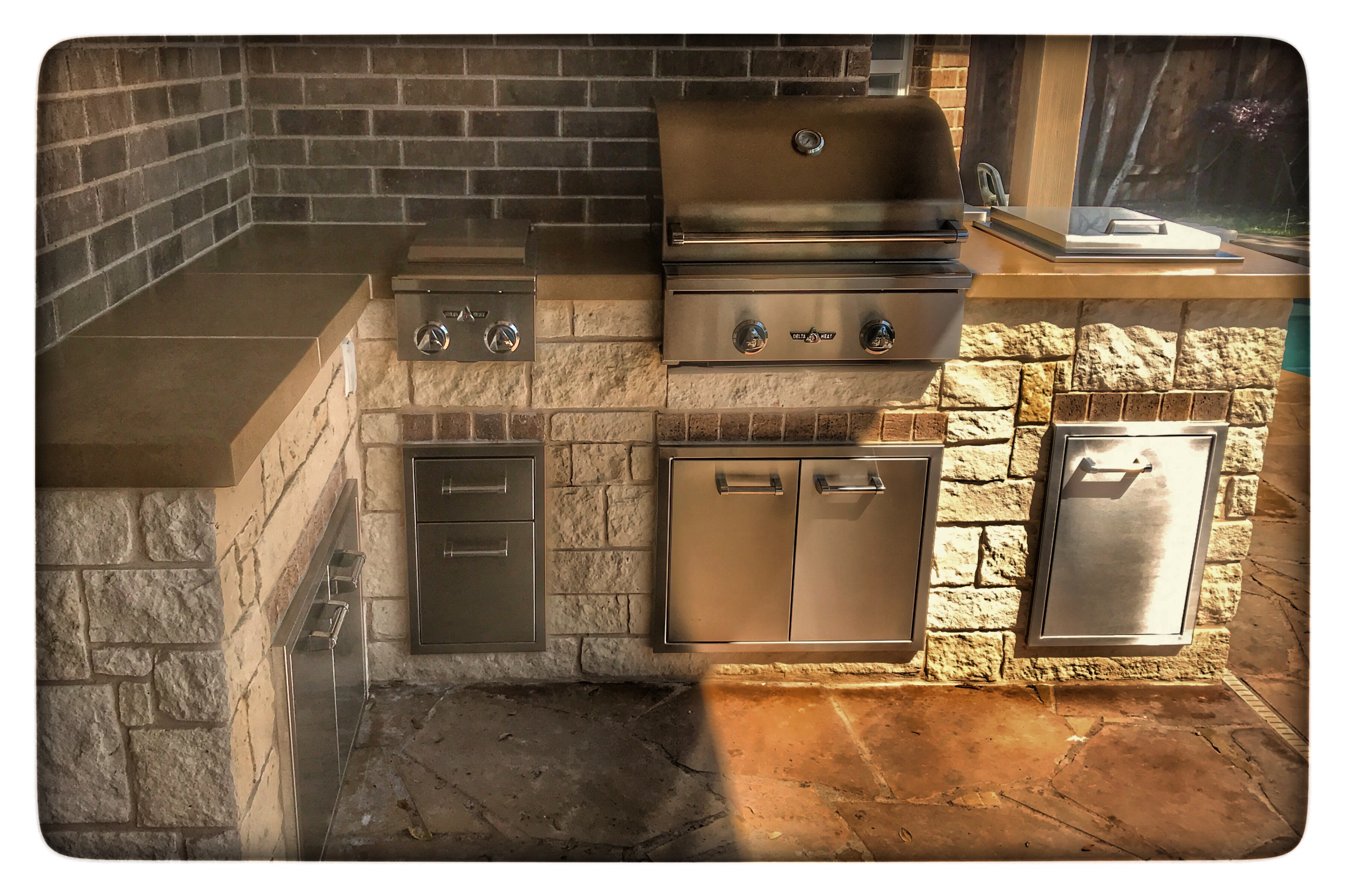 If you are thinking about having an outdoor kitchen built but don’t know what all appliances you want, we can help there too. We can go over your needs as to what you will be using the kitchen for and provide the right equipment based on your input. We are equipped to provide you with a true “turn-key” experience. If you are the type that likes to see & touch your options, we often recommend our customers visit the showroom at BBQ Outfitters. We can have your equipment shipped to our shop and deliver it to your home when we begin construction. We like to have every appliance being installed in your outdoor kitchen on hand when we begin. This allows us to build the structure to ensure a perfect fit for every element as we go. For a typical outdoor kitchen, we usually recommend at least a high quality grill and a matching set of doors below the grill that allows access to a gas shut-off valve or propane tanks. Just these few elements alone can make for a very tasteful installation. More often than not, customers choose to add other features to their island such as a sink (Need water lines ran to the kitchen? No problem!), an outdoor rated refrigerator or ice-maker, additional storage such as door/drawer combo units, side burner units, pizza ovens, and more. We also have customers that want a komodo grill such as The Big Green Egg or a Primo, built into the kitchen like this. We think this really adds to the visual aesthetics of the structure and makes for a very “professional” look.